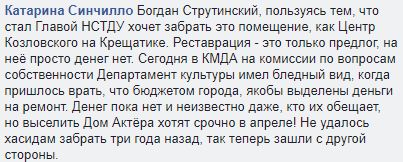 Актриса и художественный руководитель театра КХАТ Катарина Синчилло утверждает: "Богдан Струтинский, пользуясь тем, что стал главой Национального союза театральных деятелей, хочет забрать это помещение, как Центр Козловского на Крещатике. Реставрация – это только предлог".