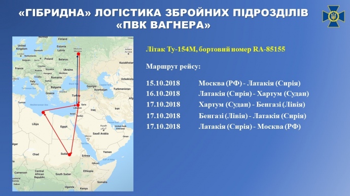 "Так, согласно договору № В218/4/119 от 30.07.2018 (общая сумма 56 млн российских рублей) между указанным выше ООО "М Инвест" и "223 летным отрядом" МО РФ, самолетами Ту-154М (бортовые номера RA- 85041, RA-85155) за пять месяцев 2018 года осуществлено восемь рейсов из Москвы (через российскую авиабазу Хмеймим в сирийской Латакии) в столицу Судана Хартум", - рассказали в Службе безопасности Украины.