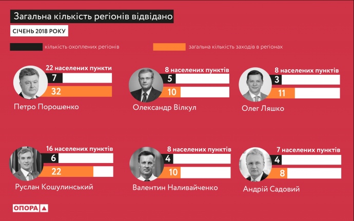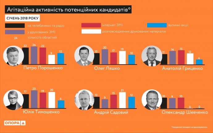 "Абсолютными лидерами по масштабам и интенсивности агитационной деятельности в январе 2019 года остаются Петр Порошенко и Юлия Тимошенко. Так же активными, но не так территориально разветвленными, являются агитационные кампании Олега Ляшко и Андрея Садового", - говорится в сообщении.
