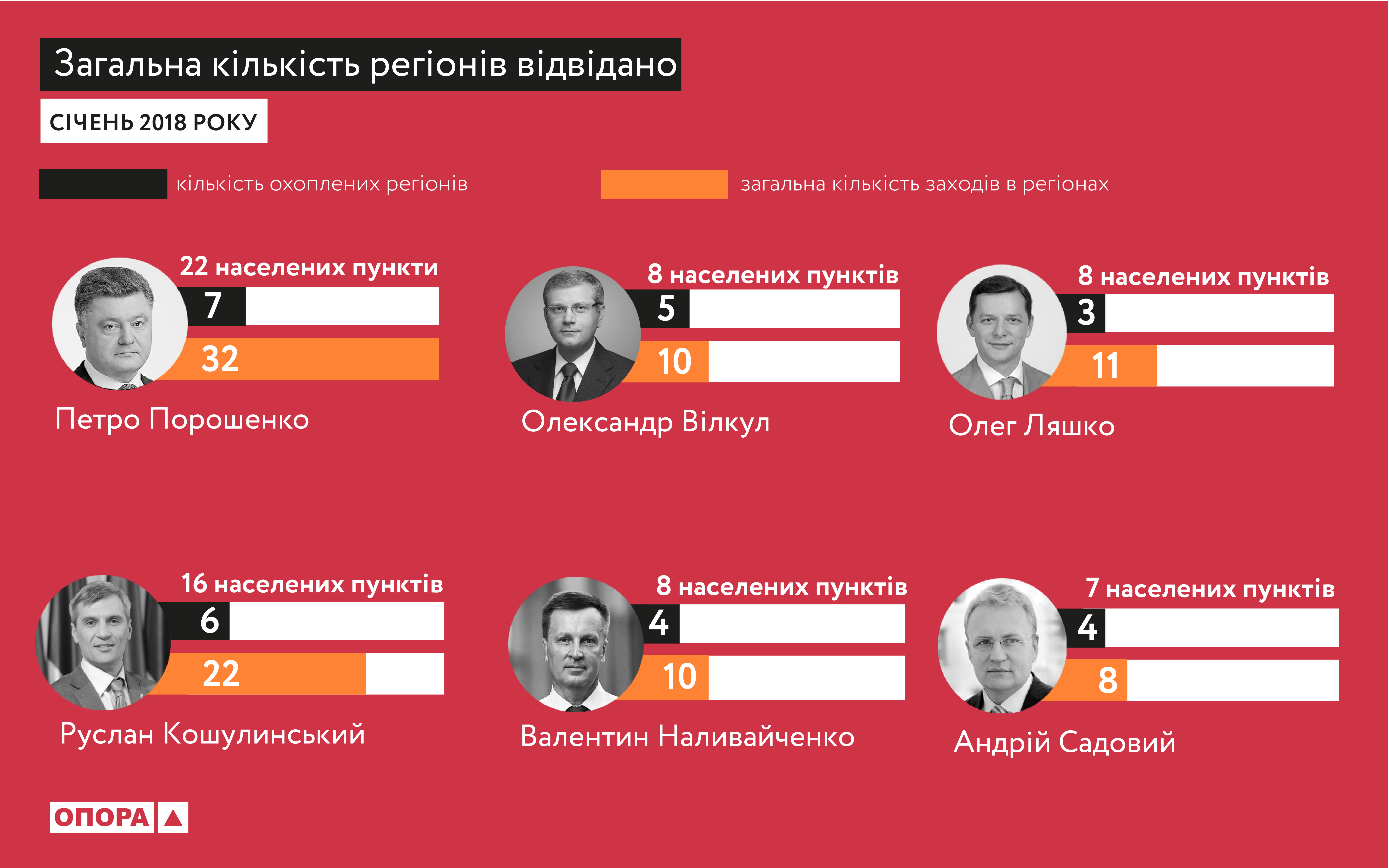 В то же время агитационные кампании других активных кандидатов (Александра Вилкула, Юрия Бойко, Сергея Каплина) в январе имели только региональный уклон.