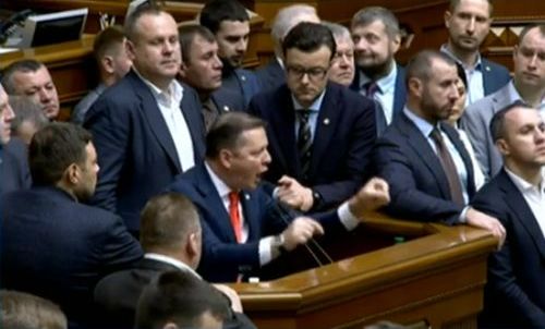Лидер фракции "Радикальной партии" Олег Ляшко в окружении коллег заявил: "Вы, представители БПП, бились бы так за людей. Вот мы блокируем со вторника трибуну, чтобы заставить Верховную Раду рассмотреть правильность начисления тарифов, чтобы людей не грабили, когда люди получают космические платежки, большие, чем их зарплаты и пенсии".