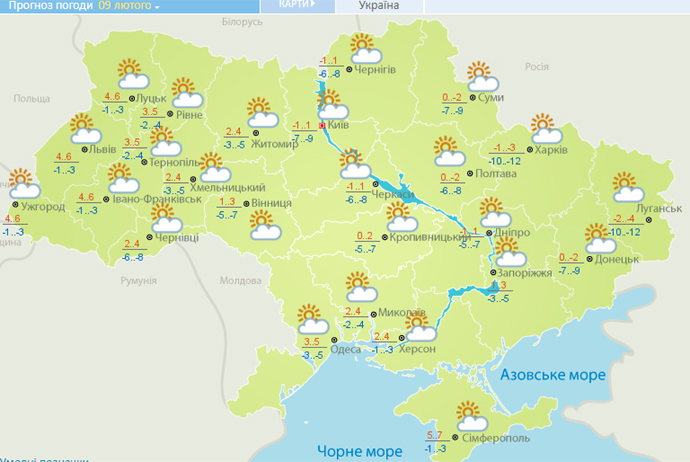 По прогнозу Укргидрометцентра, ночью 9 февраля на западе и юге -2-4, на остальной территории до -7-9, днем на западе до +6, на юге до +4, на востоке до -4, на остальной территории около 0, без осадков.