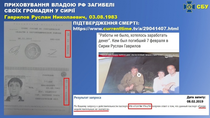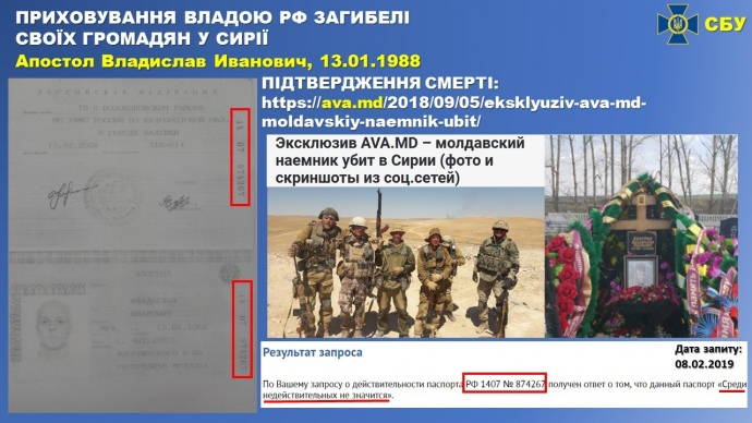 В СБУ добавили, что данные о смерти "вагнеровцев" подкреплены свидетельствами их родных об обстоятельствах смерти в Сирии, фотографиями свидетельств о смерти и мест захоронений наемников.