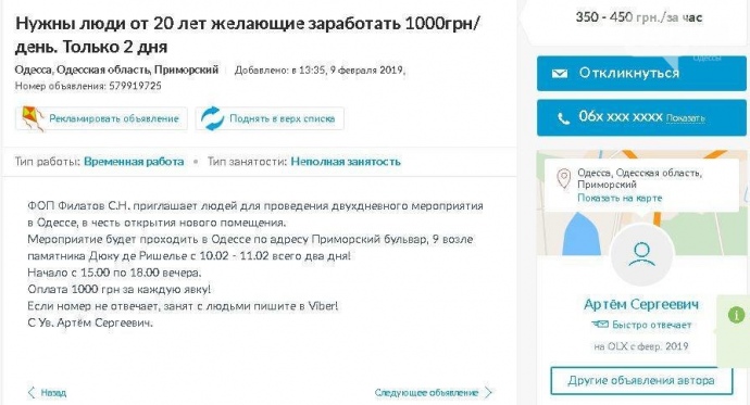 Участникам обещали заплатить по 1000 гривен и премию за привлеченных людей.