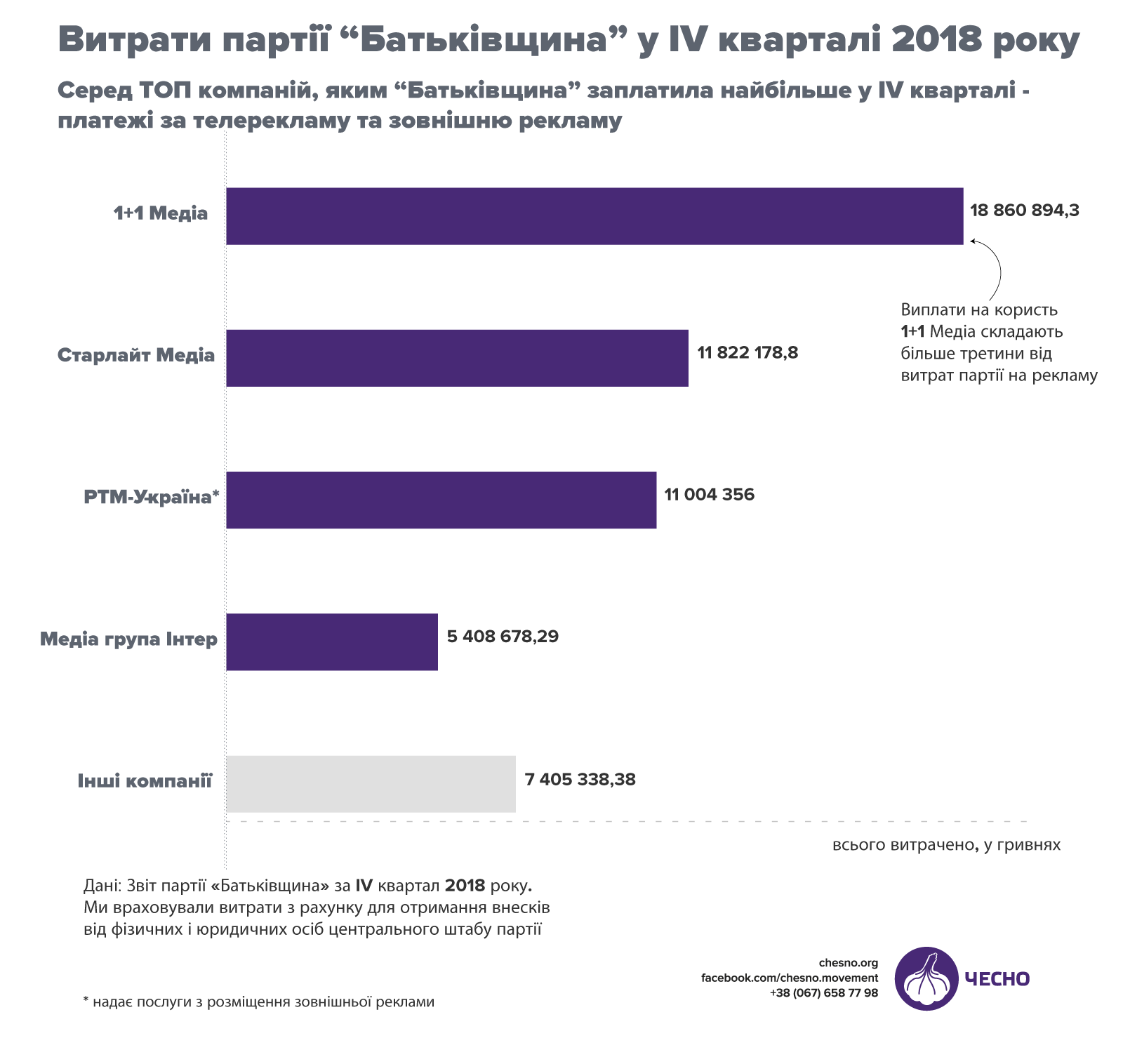 Также сообщается, что на конец 2018 года ВО "Батькивщина" не полностью рассчиталось за рекламу перед ООО "Старлайт бренд контент" ("СТБ", "Новый канал", "ICTV"). Партия должна холдингу еще почти 10 миллионов гривен.