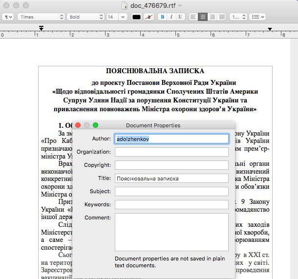 Пояснительную записку к проекту постановления народного депутата от "Радикальной партии" Игоря Мосийчука о присвоении Ульяной Супрун полномочий министра готовили на компьютере нардепа от Оппоблока Александра Долженкова.
