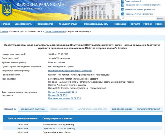 Постановление зарегистрировали 8 февраля 2019 года. Оно предлагает признать действия Ульяны Супрун наносящими вред интересам украинского народа и государства.