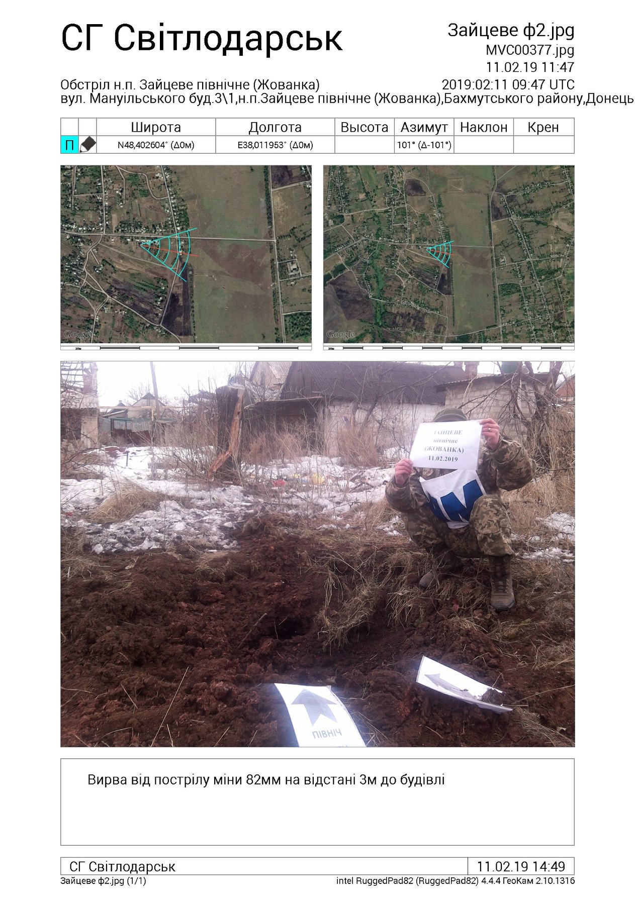 Прибыв на место обстрела, наблюдательная группа украинской стороны СЦКК зафиксировала повреждения двора дома, а также воронку диаметром до полутора метров на расстоянии примерно трех метров от жилого здания.