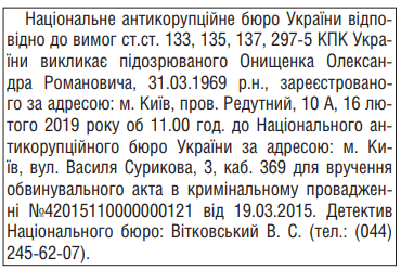 Национальное антикоррупционное бюро вызывает для вручения обвинительного акта беглого нардепа Александра Онищенко, подозреваемого в создании незаконной газовой схемы.