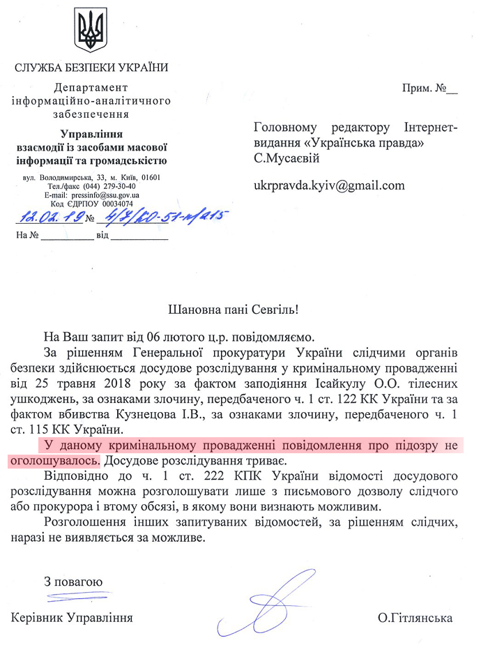 На другие вопросы запроса в СБУ не ответили, отметив, что "разглашение других запрашиваемых сведений, по решению следователей, сейчас не представляется возможным".