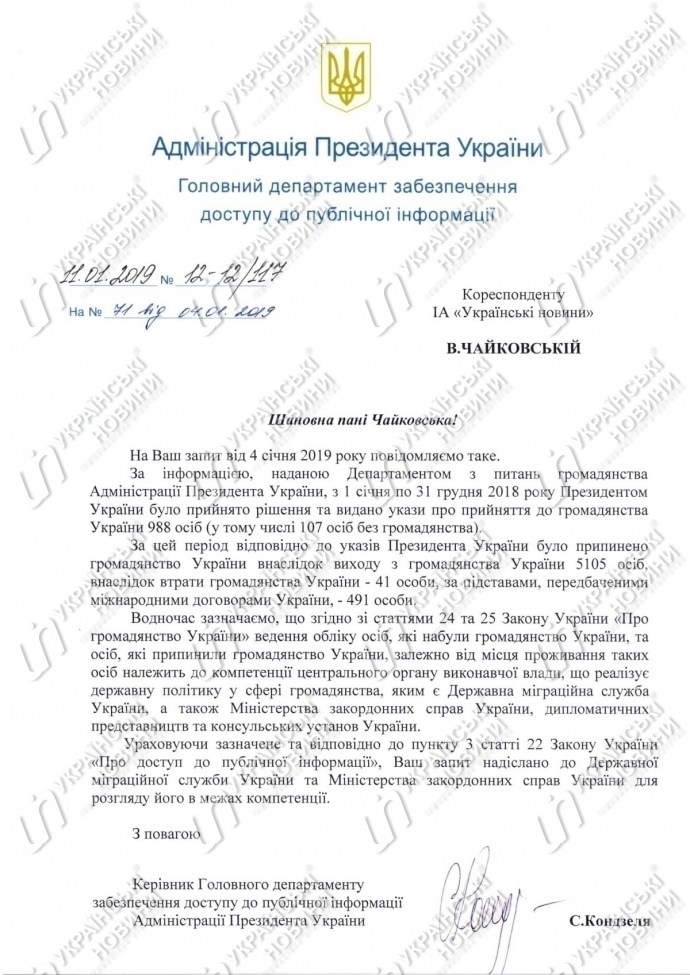 Так, за 2018 год президентом было прекращено украинское гражданство 5637 человек.