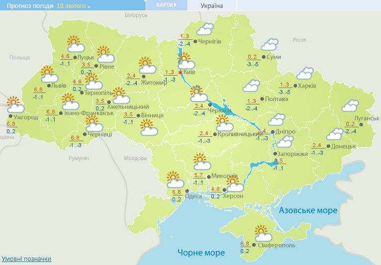 18 февраля ночью в северных, центральных и восточных областях, днем в Украине снижение температуры на 3-5°.