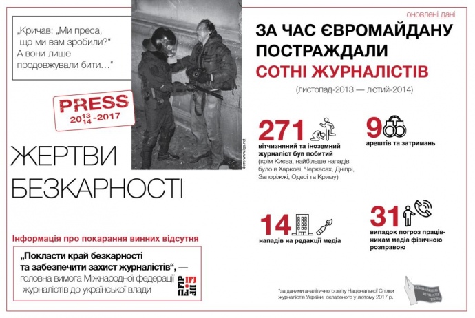 В НСЖУ напомнили, что в период с ноября 2013 по февраль 2014 года от физических атак правоохранителей или титушок пострадал 271 журналист. Больше всего нападений, кроме Киева, было в Харькове, Черкассах, Днепре, Запорожье, Одессе и в Крыму.