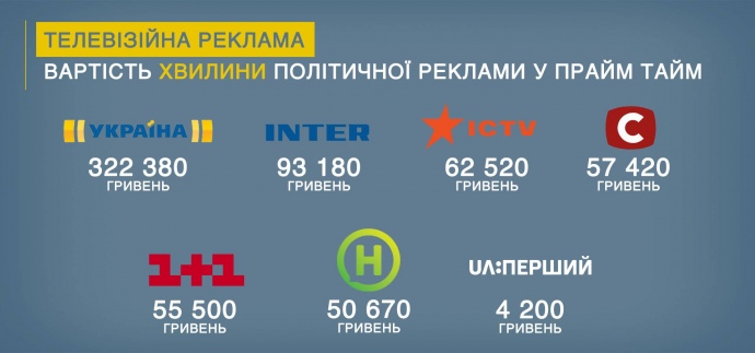 По данным журналистов, больше всего политики платят за рекламу на телевидении, где 1 минута в прайм-тайм на центральных телеканалах стоит от 4 до 350 тысяч гривень.