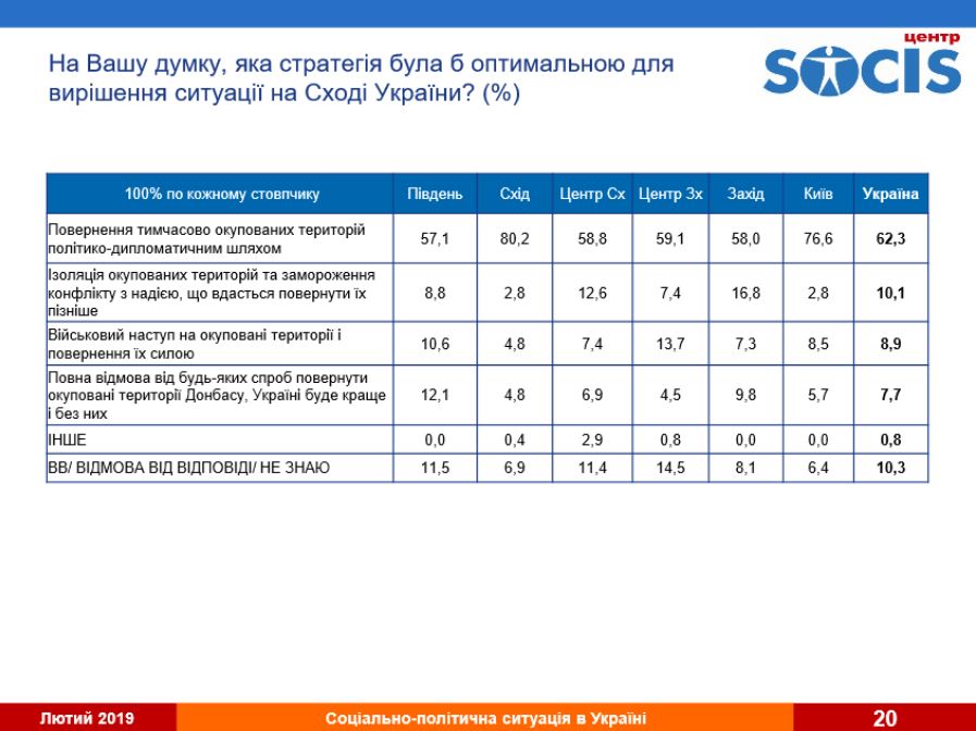 Почти 9% опрошенных за военное наступление на оккупированные территории и возвращения их силой, 7,7% предлагают вообще отказаться от возвращения украинских территорий, поскольку считают, что стране будет лучше без них.