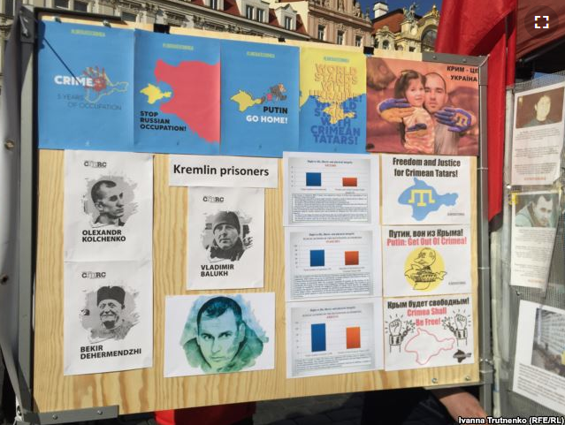"Участники флешмоба установили доску с именами и портретами украинских политзаключенных в России и в Крыму, агитационными призывами "Putin go home!", "Stop Russian occupation!" и принесли с собой крымскотатарскую и украинскую символику.