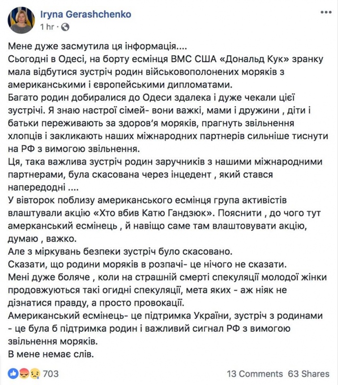 Ранее в среду уполномоченный президента по вопросам мирного урегулирования ситуации в Донбассе первый вице-спикер Ирина Геращенко в Facebook заявила, что встреча семей военнопленных украинских моряков с дипломатами в Одессе сорвана из-за действий активистов сообщества "Кто заказал Катю Гандзюк?".