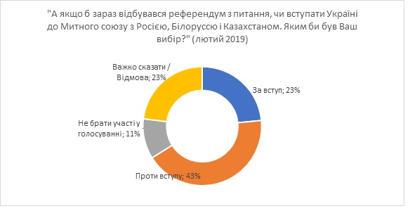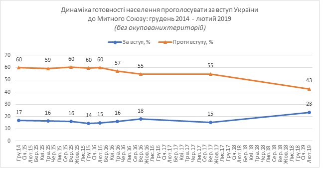 Отмечается, что процент готовых проголосовать за вступление в Таможенный союз в феврале 2019 года был немного выше, чем во время предыдущих опросов, проведенных после аннексии Крыма и вооруженной агрессии России.