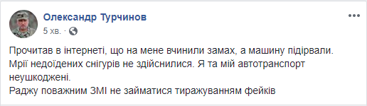 "В сети интернет начала распространяться информация по поводу якобы "покушения на жизнь секретаря СНБО Украины Александра Турчинова и подрыва его автомобиля". По этому поводу можем сообщить следующее. Александр Турчинов работает в обычном режиме. Автомобиль, которым он пользуется, не взрывался. Враги могут не радоваться ", - отметила пресс-секретарь Анна Вахоцкая.