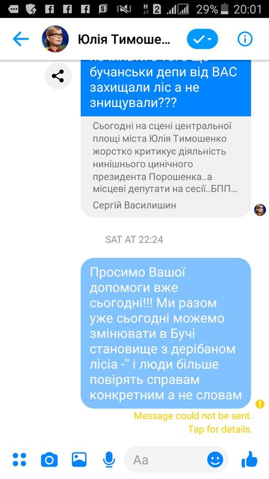 "Я прыгала и кричала, просила разрешить мне поставить Юлии Тимошенко один вопрос: почему депутаты Бучанского совета от "Батькивщины" голосуют вместе с партией БПП за уничтожение леса в Буче, но мне так и не позволили подойти, а Тимошенко делала вид, что меня не слышит. Вечером я свой вопрос написала в личных сообщениях на странице Тимошенко, но меня мгновенно заблокировали", - рассказала бучанка Елена Лысенко.