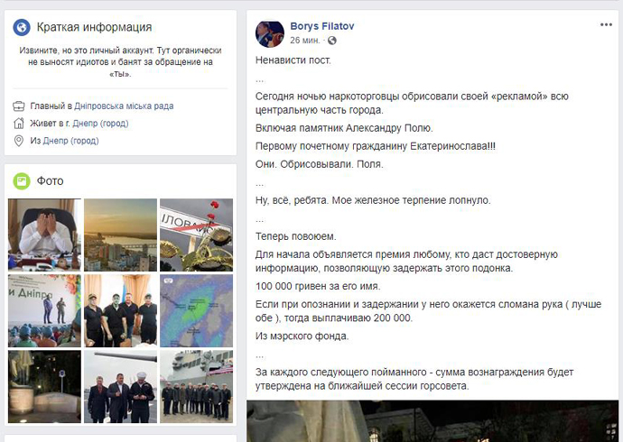 "100 000 гривен за его имя. Если при опознании и задержании у него окажется сломана рука (лучше обе), тогда выплачиваю 200 000 из мэрского фонда", - добавил он.
