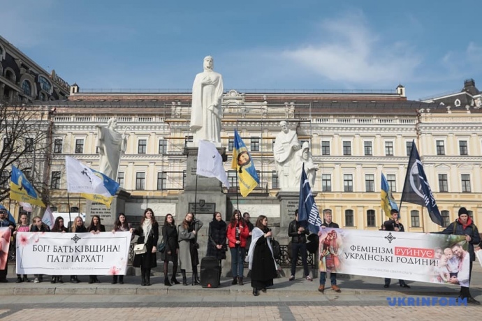 Параллельно на митинг против марша собрались несколько десятков человек. Противники Марша женщин держали плакаты с лозунгами: "Бог! Родина! Патриархат", "Феминизм разрушает украинские семьи" и "Современный феминизм искажает Богом заложенный образ женщины" и флаги, в частности, с символикой движения "Традиция и порядок".