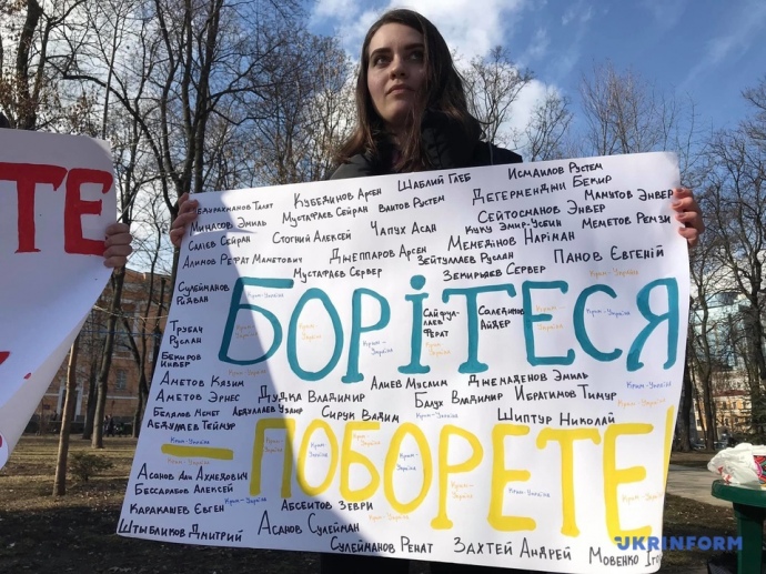 Они держат плакаты со строками Кобзаря "Боритесь - поборете" с именами украинских политзаключенных, "Вставайте, кандалы порвите", а также "Крым - это Украина", "Россия - тюрьма народов".