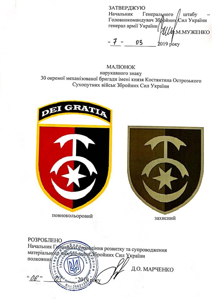 В частности, утверждены рисунки нарукавных знаков 30 отдельной механизированной бригады имени князя Константина Острожского Сухопутных войск ВСУ, 58 отдельной мотопехотной бригады имени гетмана Ивана Выговского Сухопутных войск ВСУ и 72 отдельной механизированной бригады имени Черных Запорожцев Сухопутных войск ВСУ.