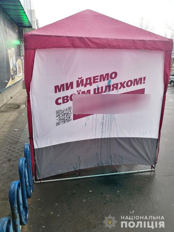 "10 марта около 11:45 двое неизвестных в возрасте около 20 лет в черной одежде подошли к палатке одного из кандидатов в президенты Украины, расположенного возле остановки общественного транспорта Автопарк по ул.Космонавтов. Выражая недовольство деятельностью кандидата, они облили зеленкой палатку", - сообщили в полиции.