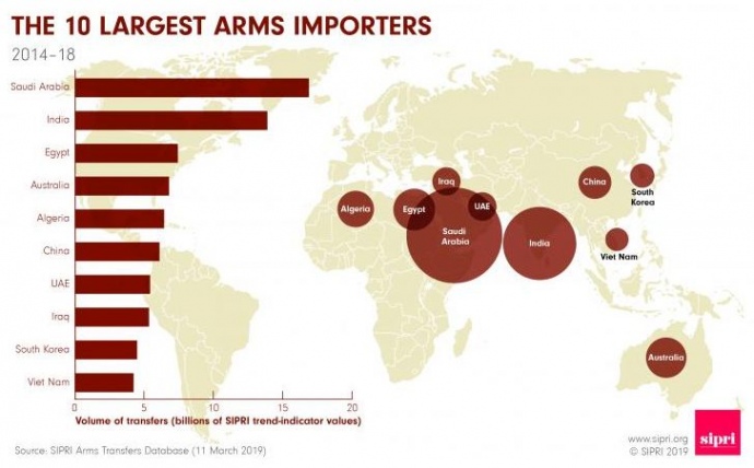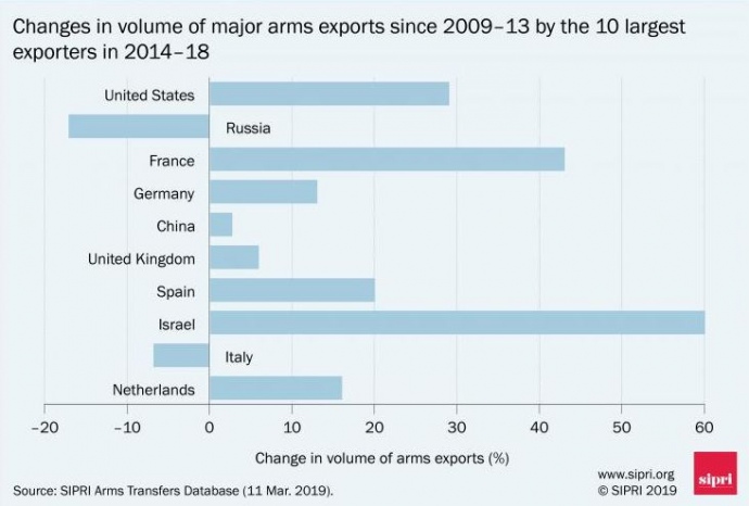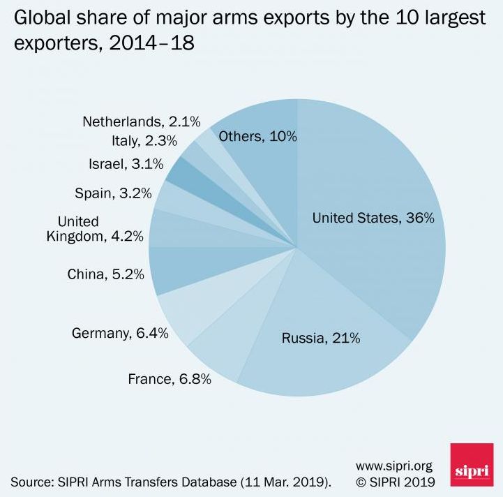 Пятерку крупнейших экспортеров в 2014-18 годах составляли США, Россия, Франция, Германия и Китай. Вместе на них приходилось 75% общего объема экспорта вооружений в 2014-2018 годах.