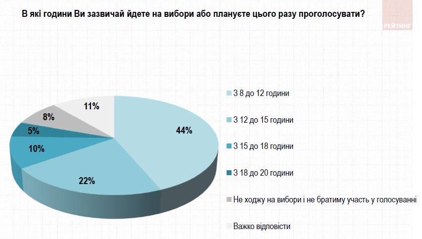 44% опрошенных заявили, что обычно голосуют утром – с 8 до 12:00. 22% – преимущественно голосуют с 12 до 15 часов, 10% – с 15 до 18 часов и только 5% – после 18 часов.