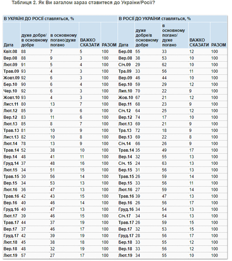 В феврале 2019 года количество украинцев, которые хорошо или очень хорошо относятся к России, выросло на 9 процентных пунктов и составляет 57%.