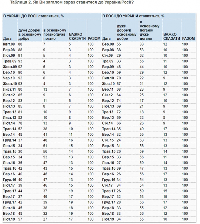 Также сообщается, что за весь период наблюдений (с 2008 по 2019 год) украинцы лучше относились к России, чем россияне к Украине.
