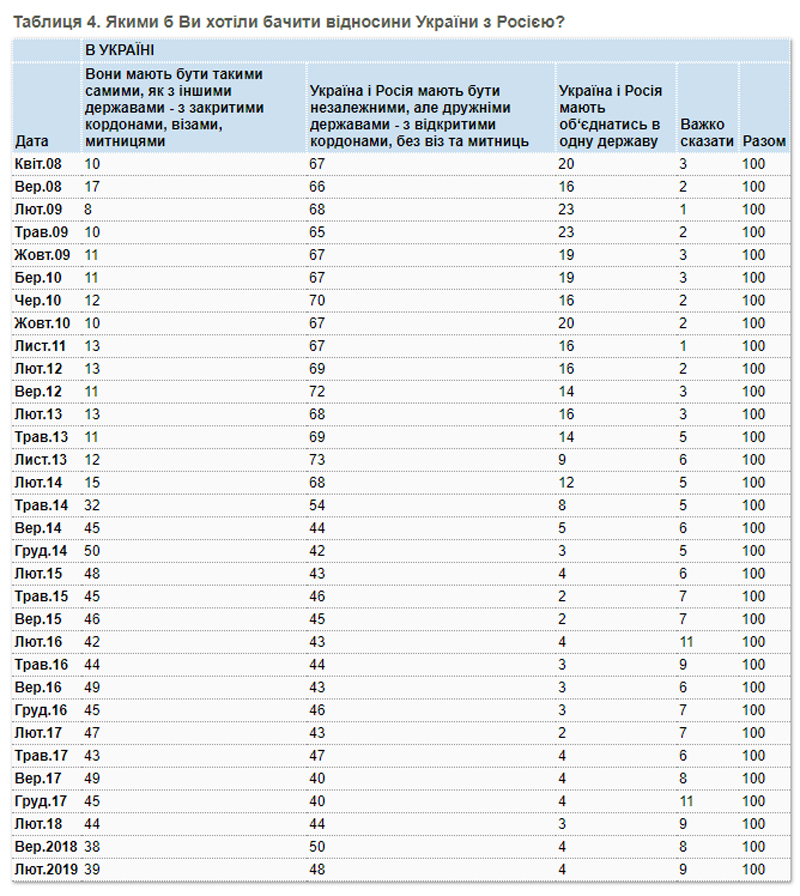 Социологи выяснили, что почти 90% населения считают, что Украина должна быть независимым государством. При этом по сравнению с февралем 2018 года количество желающих закрыть границы с Россией, уменьшилось (с 44% до 39%), а количество тех, кто желает независимых отношений, но без границ и таможен, увеличилось (с 44% до 48%).