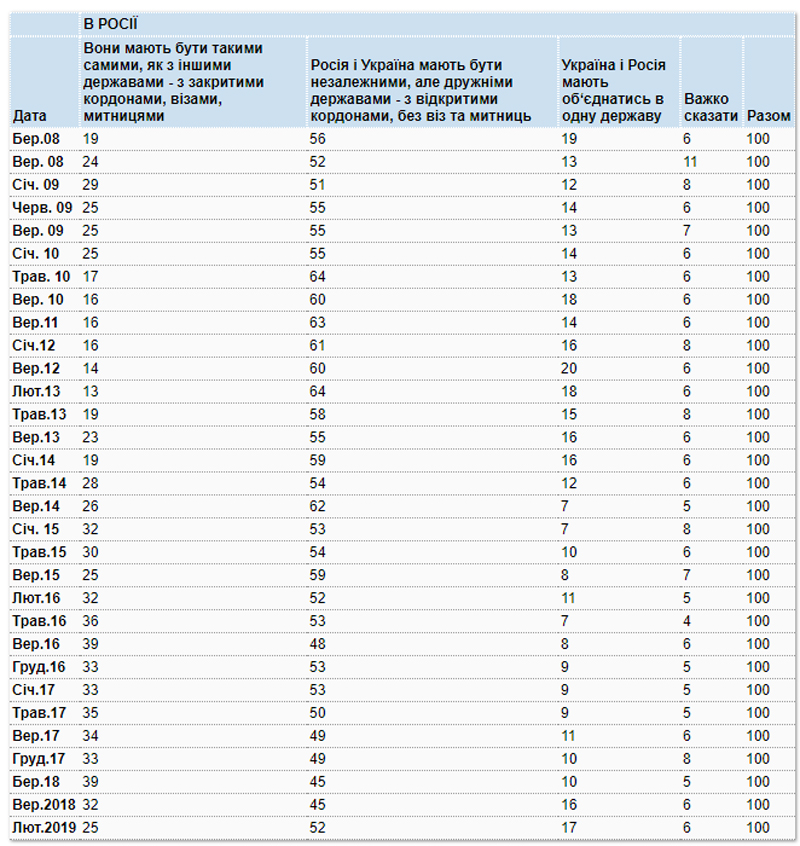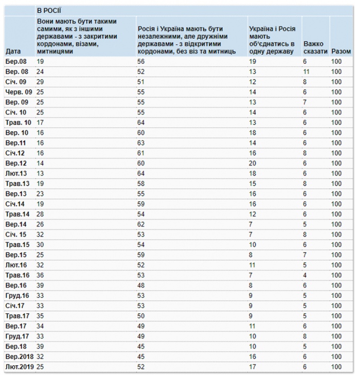 "В феврале 2019 года в России хорошо или очень хорошо относилось к Украине 34% населения, плохо или очень плохо 55%, то есть сейчас украинцы намного лучше относятся к России, чем россияне к Украине", - отмечают социологи.