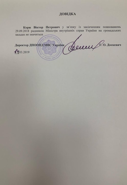 В то же время справка о том, что Корж больше не является советником Авакова, датированная 14 марта 2019 года.