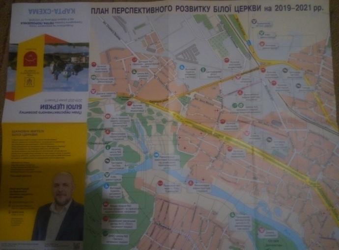 "В Белой Церкви (Киевская обл.) в жилых домах распространяют карты города с "перспективным планом развития". На карте обозначены объекты, которые будут финансироваться в 2019-2021 гг., и размещены фото мэра города Геннадия Дикого и кандидата в президенты Петра Порошенко. На конвертах, в которых распространяются материалы, есть подписи "Совет Регионального Развития" и "Президент Украины Петр Порошенко", - отмечают эксперты.
