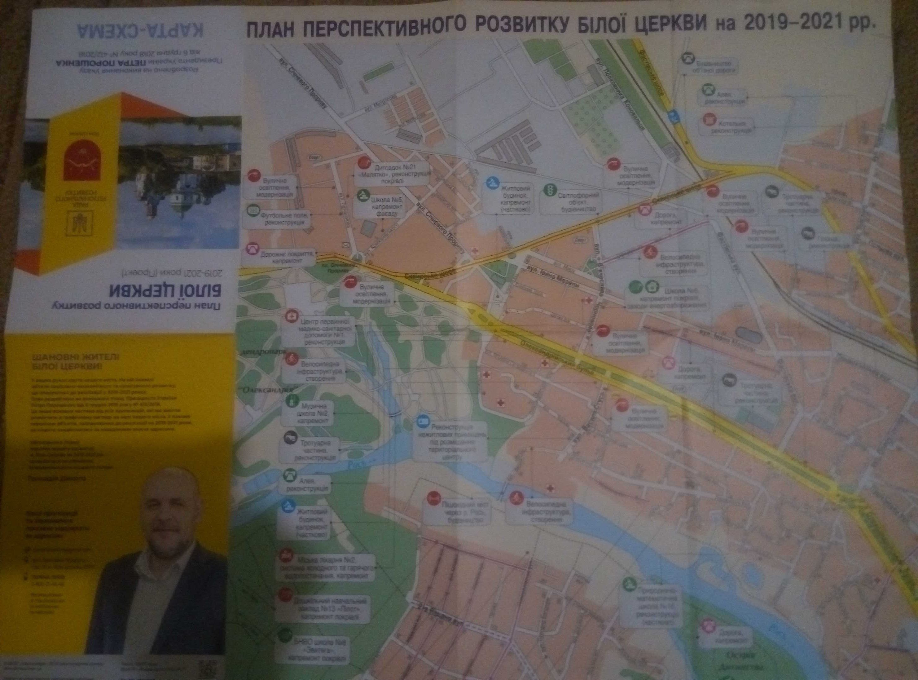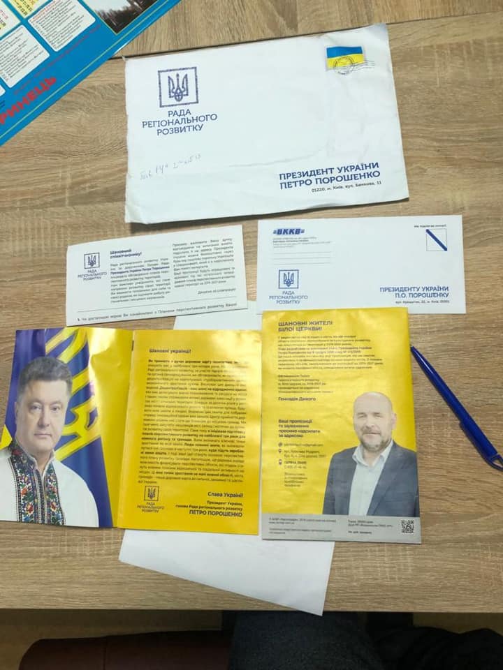"В Белой Церкви (Киевская обл.) в жилых домах распространяют карты города с "перспективным планом развития". На карте обозначены объекты, которые будут финансироваться в 2019-2021 гг., и размещены фото мэра города Геннадия Дикого и кандидата в президенты Петра Порошенко. На конвертах, в которых распространяются материалы, есть подписи "Совет Регионального Развития" и "Президент Украины Петр Порошенко", - отмечают эксперты.
