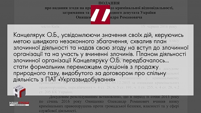 - Нардеп Александр Онищенко, по версии следствия, с сообщниками продавали газ госпредприятия "Укргаздобыча" с помощью нескольких своих компаний за "псевдобиржи", что нанесло государству ущерб на сумму более 1,613 миллиарда гривен.