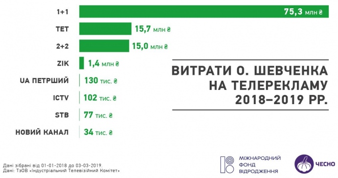 Большинство рекламных роликов с Шевченко в 2018 году транслировали на телеканалах группы "1+1 медиа" ("1+1", "2+2", "ТЕТ"), принадлежащих Игорю Коломойскому. Незначительную часть роликов транслировал телеканал "ZIK" бизнесмена и политика Петра Дыминского.