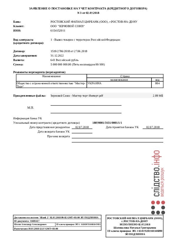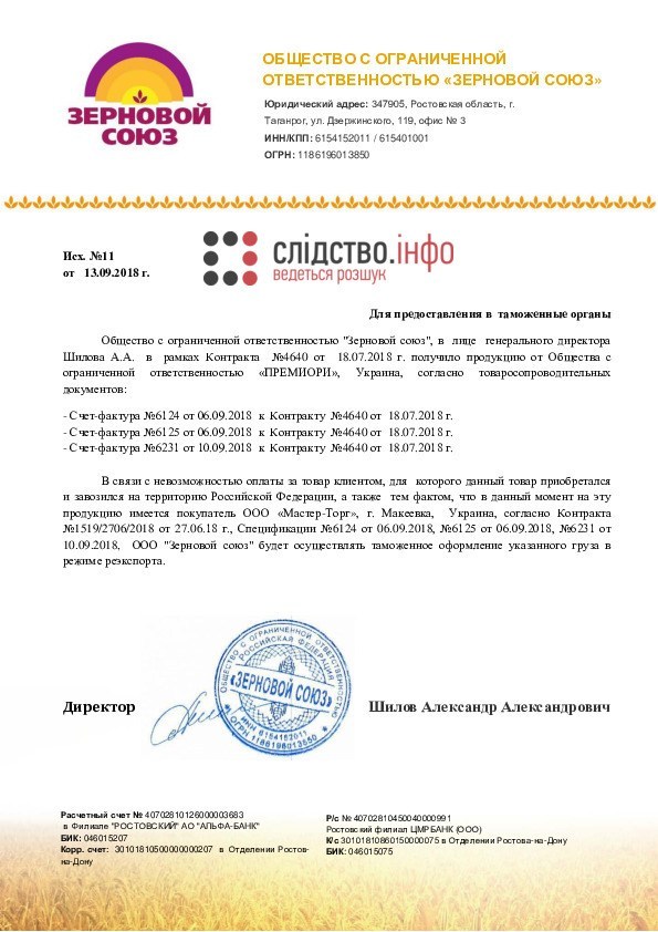 В частности, за несколько дней до заключения договора с украинской "Премиори", "Зерновой союз" подписал еще один контракт с макеевской фирмой "Мастер-Торг" на почти 8 млн долларов.