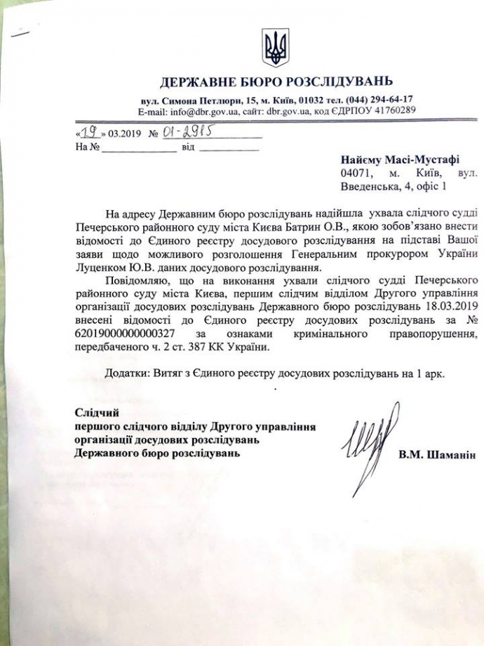 28 февраля Печерский районный суд г. Киева вынес решение: удовлетворил жалобу Маси Найема на бездействие следователей и обязал последних зарегистрировать уголовное производство. В тот же день суд направил в ГБР копию этого постановления с сопроводительным письмом.