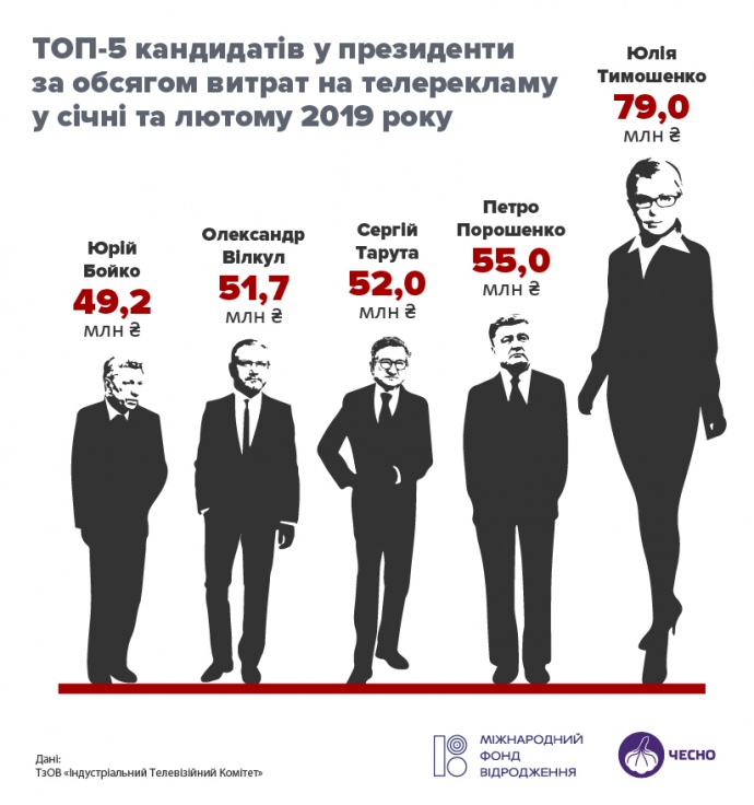 За январь и февраль общая стоимость рекламы участников президентских выборов составила около 448 миллионов гривен. При этом вся реклама будущих кандидатов, выходила в 2018 году должна стоить около 568 миллионов. Таким образом, по состоянию на конец февраля 2019 года, общий объем расходов кандидатов на рекламу уже перевалил за миллиард.