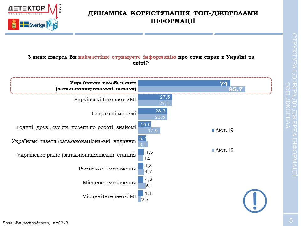 "Вместе с этим, в случае интернет-ресурсов изменений практически не было: если в феврале 2018 года 27% говорили об украинских интернет-сайтах, то сейчас – 27,5%, в случае социальных сетей, как в прошлом году, так и сейчас 23,5% получают информацию из этого источника", - пишут социологи.