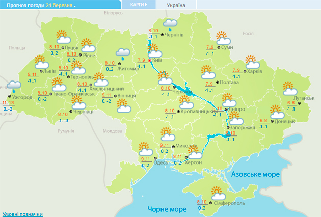 24 марта температура днем 6-11° тепла, на Закарпатье и юге Одесской области - до 14°.