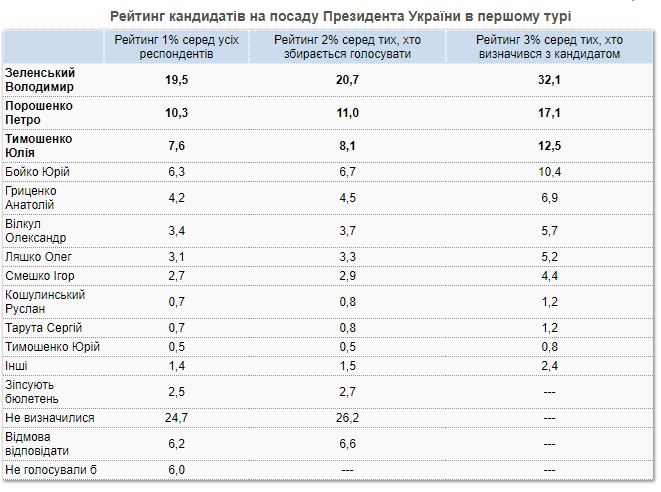 - Согласно результатам опроса, проведенного центром "Социальный мониторинг" и Украинским институтом социальных исследований им. Яременко, представленного 20 марта, Зеленского готовы были поддержать 29,4% респондентов, Тимошенко 17,2%, Порошенко - 14,9% украинцев.