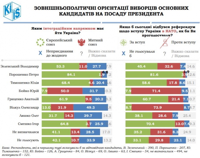Среди избирателей Владимира Зеленского сторонников ЕС и НАТО около половины (53,3% и 45,4% соответственно).