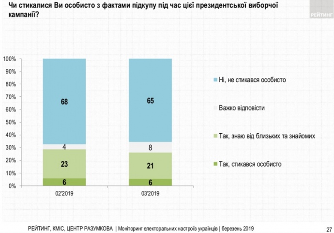 27% избирателей заявляют, что сталкивались с фактами подкупа во время этой президентской избирательной кампании, 65% говорят, что не имели такого опыта.
