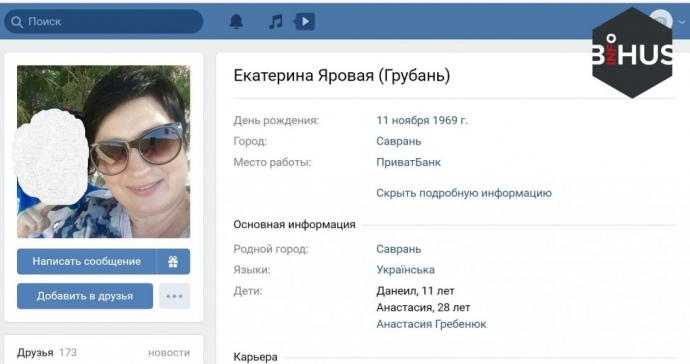 "Вероятнее всего, что ее матерью является Екатерина Яровая, которая, в свою очередь, руководит отделением "ПриватБанка" в поселке Саврань Одесской области", – отмечают журналисты.