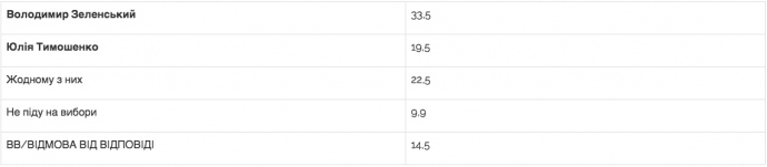 Если Зеленский во втором туре будет конкурировать с Тимошенко, то за него могут проголосовать 33,5%, а за его оппонентку – 19,5%. В то же время, 9,9% не пойдут выбирать между актером и главой "Батькивщины", а 14,5% от ответа отказались.